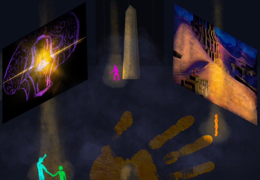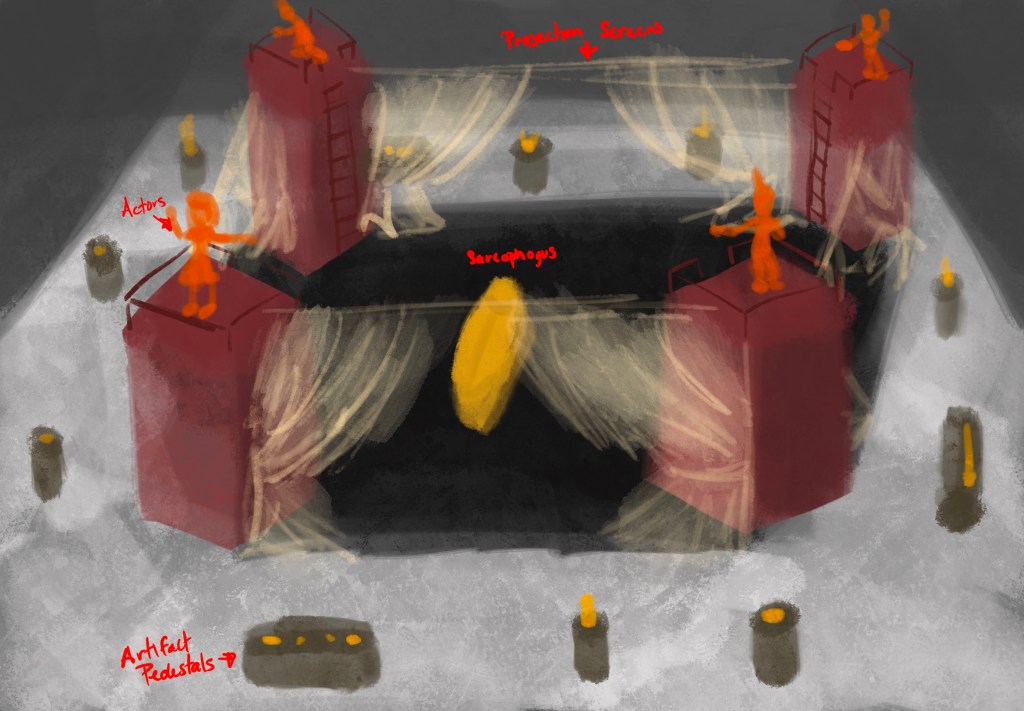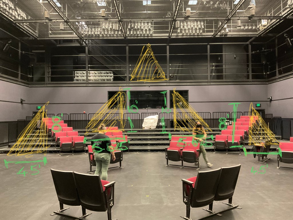 Dealing with the “In-the-round” aspect meant finding a way to place projection surfaces on at least two ends of the space while still giving actors and audience space to move around.