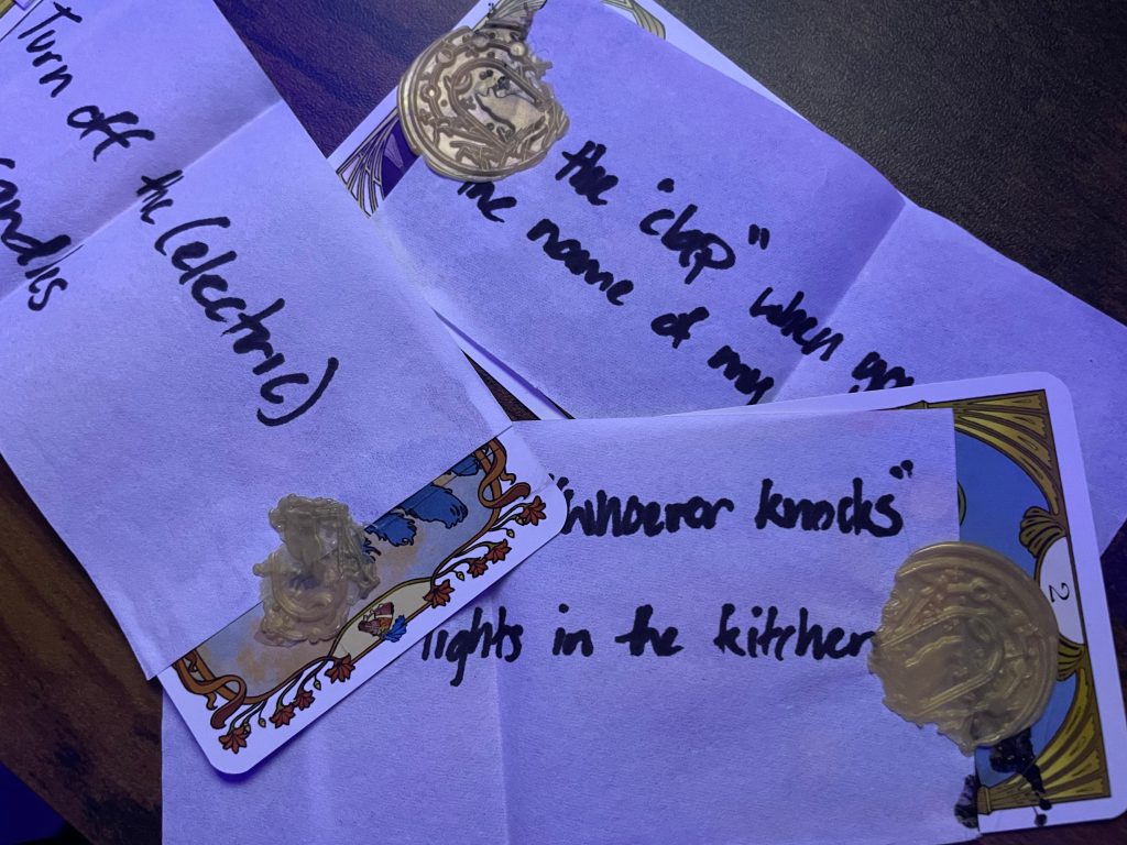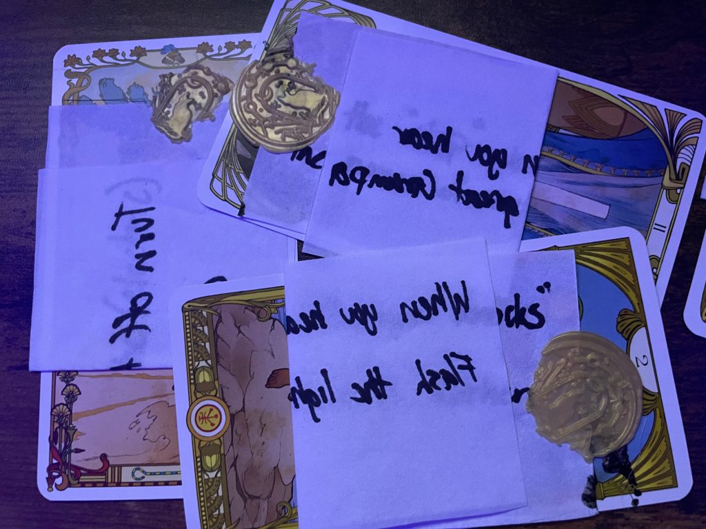 “In your envelopes are tasks. This might be something simple you can do on your own, or it might require you to gather a group, or it might be chained with another guest’s task. This won’t be as simple as announcing your task to the others, as some of you might be nonbelievers. You lack of faith in the seance actively sabotages the ritual. In either case, there are very particular steps required, but once they do, that which haunts us will appear…”